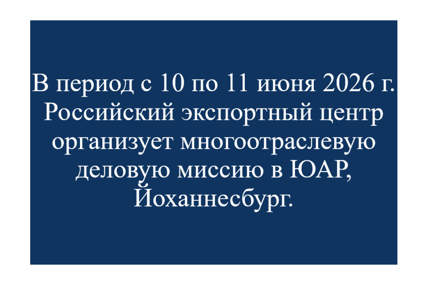 В период с 10 по 11 июня 2026 г. АО "Российский экспортный центр" организует многоотраслевую деловую миссию в ЮАР, Йоханнесбург.