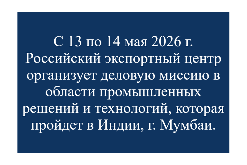 В период с 13 по 14 мая 2026 г. АО «Российский экспортный центр» организует многоотраслевую деловую миссию в области промышленных решений и технологий из Российской Федерации, которая пройдет в Индии, г. Мумбаи.